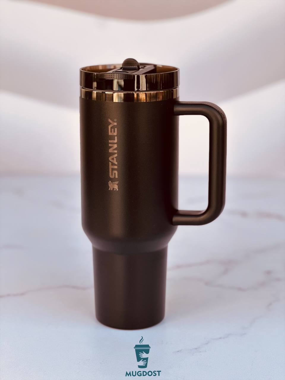تامبلر استنلی نیو کالکشن سبز و طلایی با طراحی لاکچری، استیل دوجداره ضد زنگ، حجم ۱.۱۸ لیتر، نیدار، ضد نشتی و مناسب کاپهولدر ماشین. محصول جدید ۲۰۲۵.