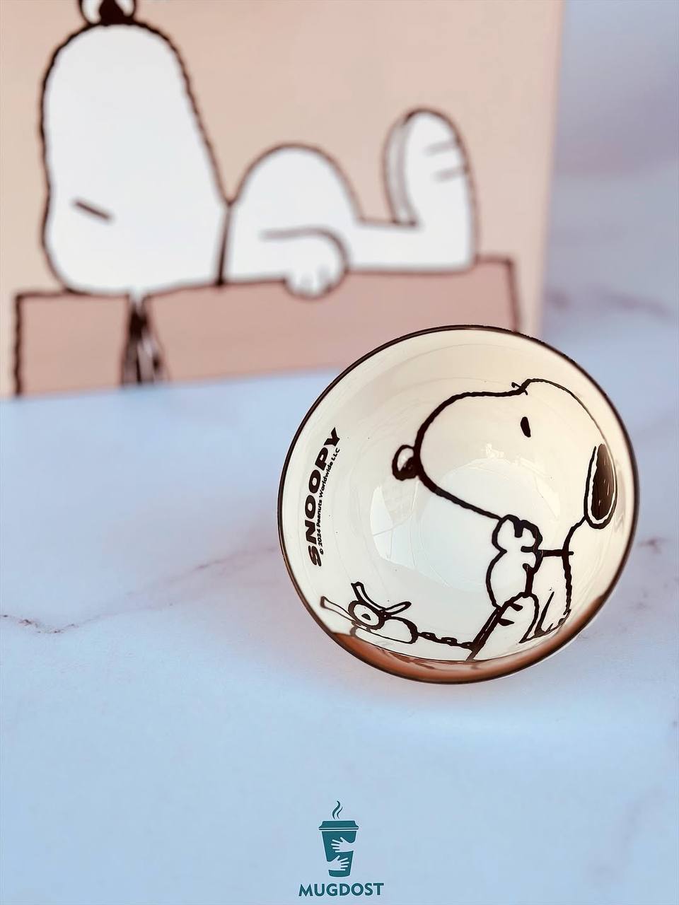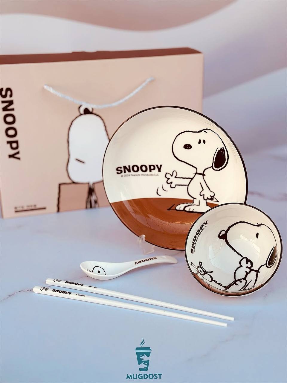 سرویس تک نفره اسنوپی سفید و قهوهای با جنس سرامیکی، طراحی نوستالژیک و اقلام کامل، برای استفاده روزمره یا هدیه انتخابی شیک و کاربردی است.