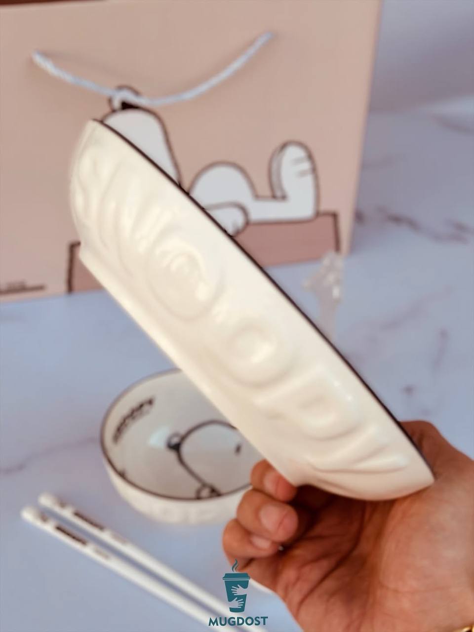 سرویس تک نفره اسنوپی سفید و قهوهای از جنس سرامیکی باکیفیت ساخته شده و حس خوبی در زمان استفاده ایجاد میکند. این سرویس شامل بشقاب، کاسه، قاشق و چاپستیک است و تمام نیازهای یک وعده غذایی تکنفره را بهصورت کامل پوشش میدهد. هماهنگی طرح و رنگ اجزای این ست باعث میشود میز غذا ظاهری منظم و شیک داشته باشد.