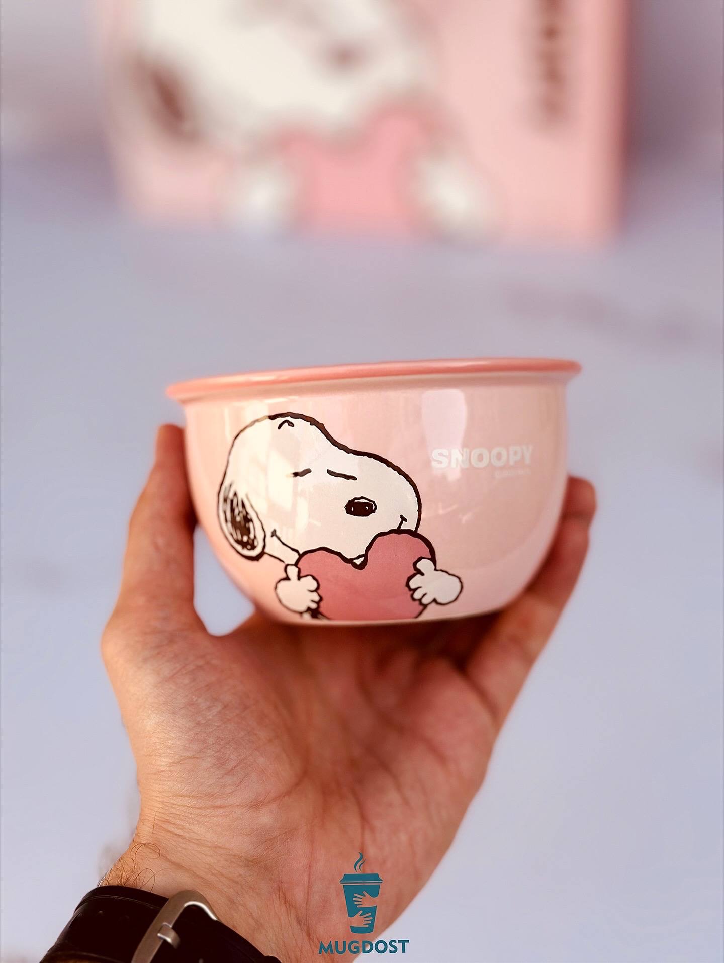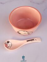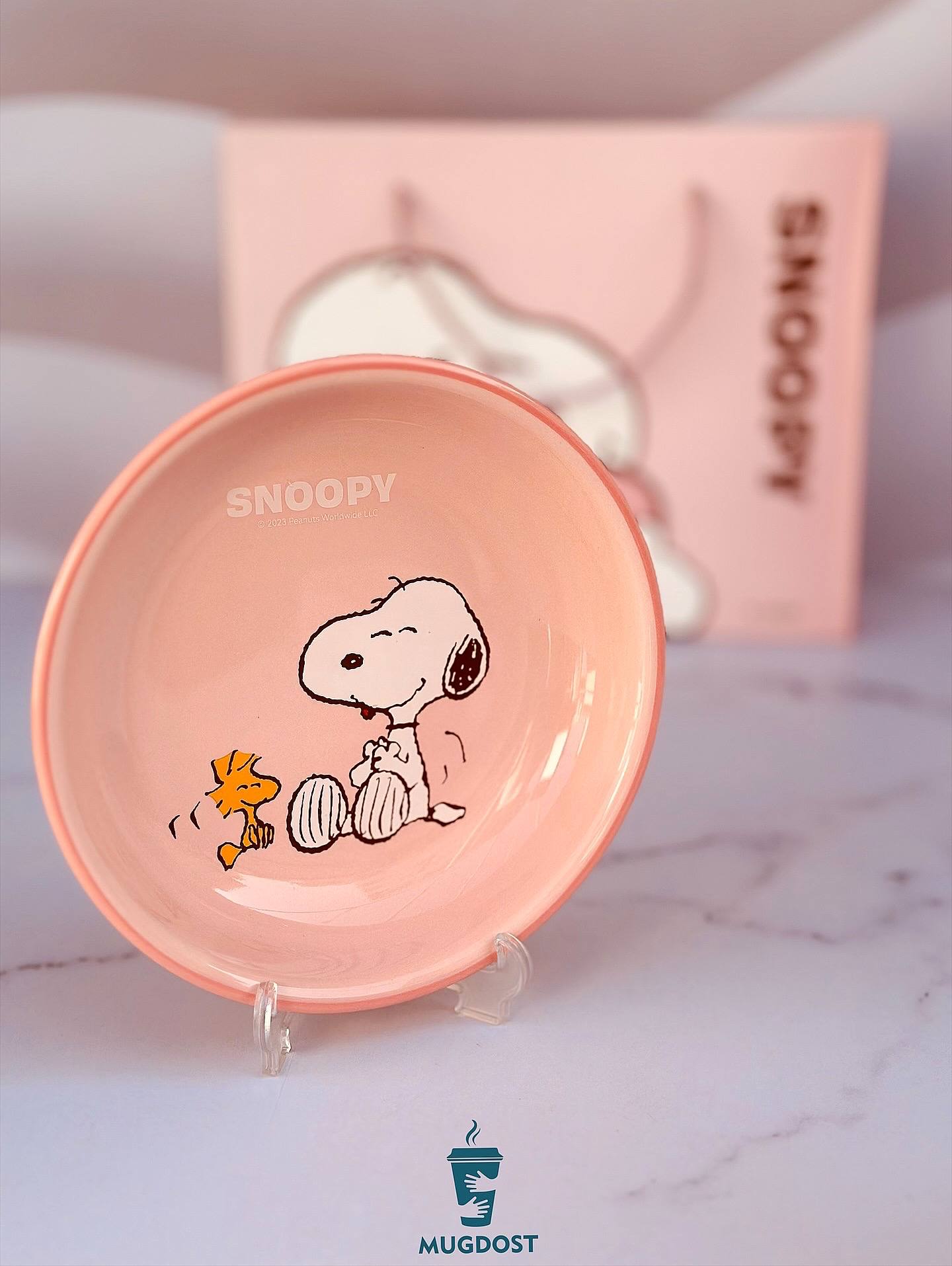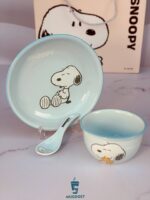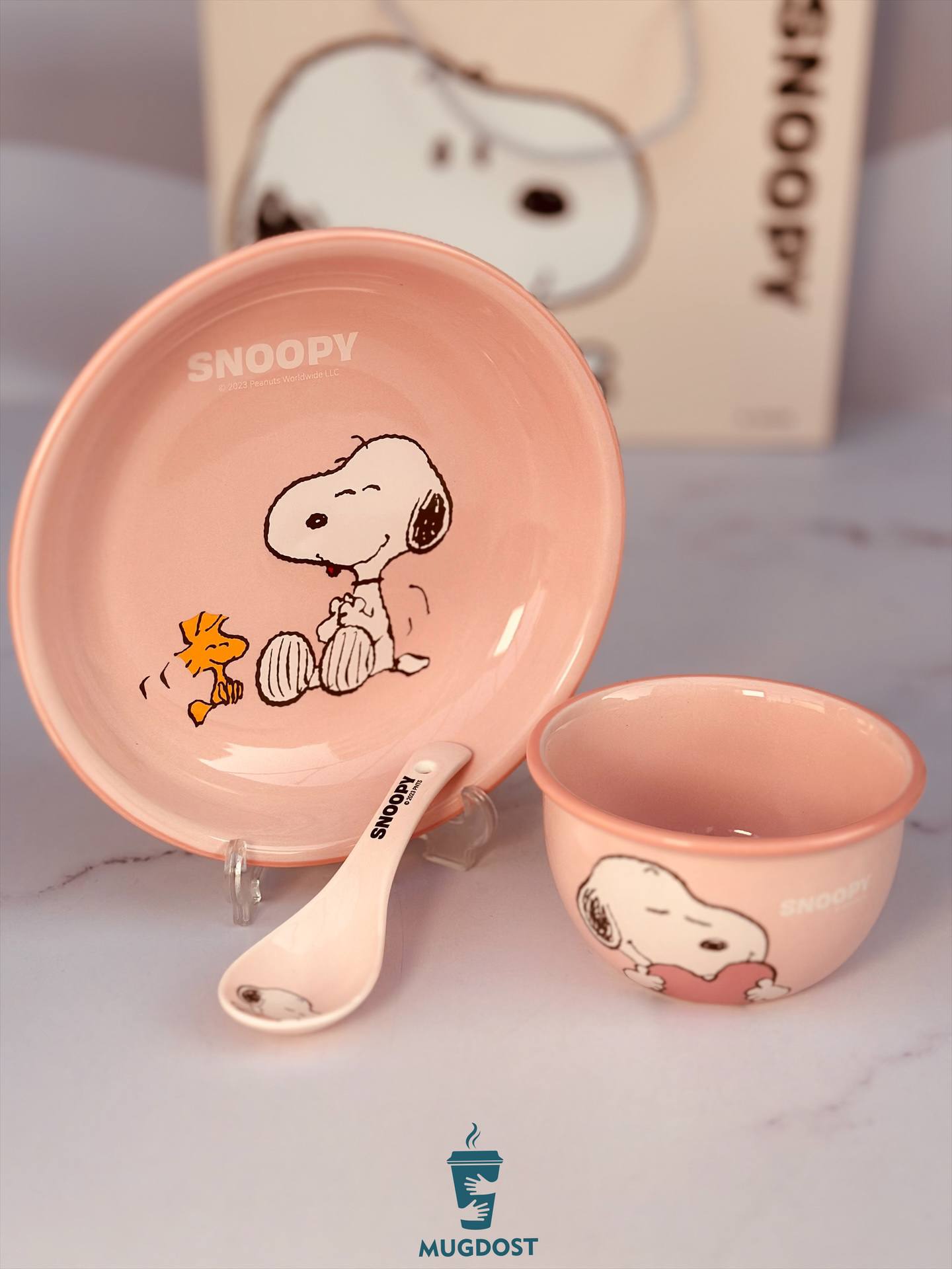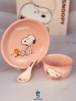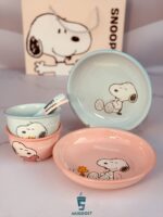 سرویس دونفره اسنوپی صورتی و آبی شامل بشقاب، کاسه و قاشق، قابل استفاده در ماکروفر و ماشین ظرفشویی، ارائه شده در پک کادویی شیک و جذاب.