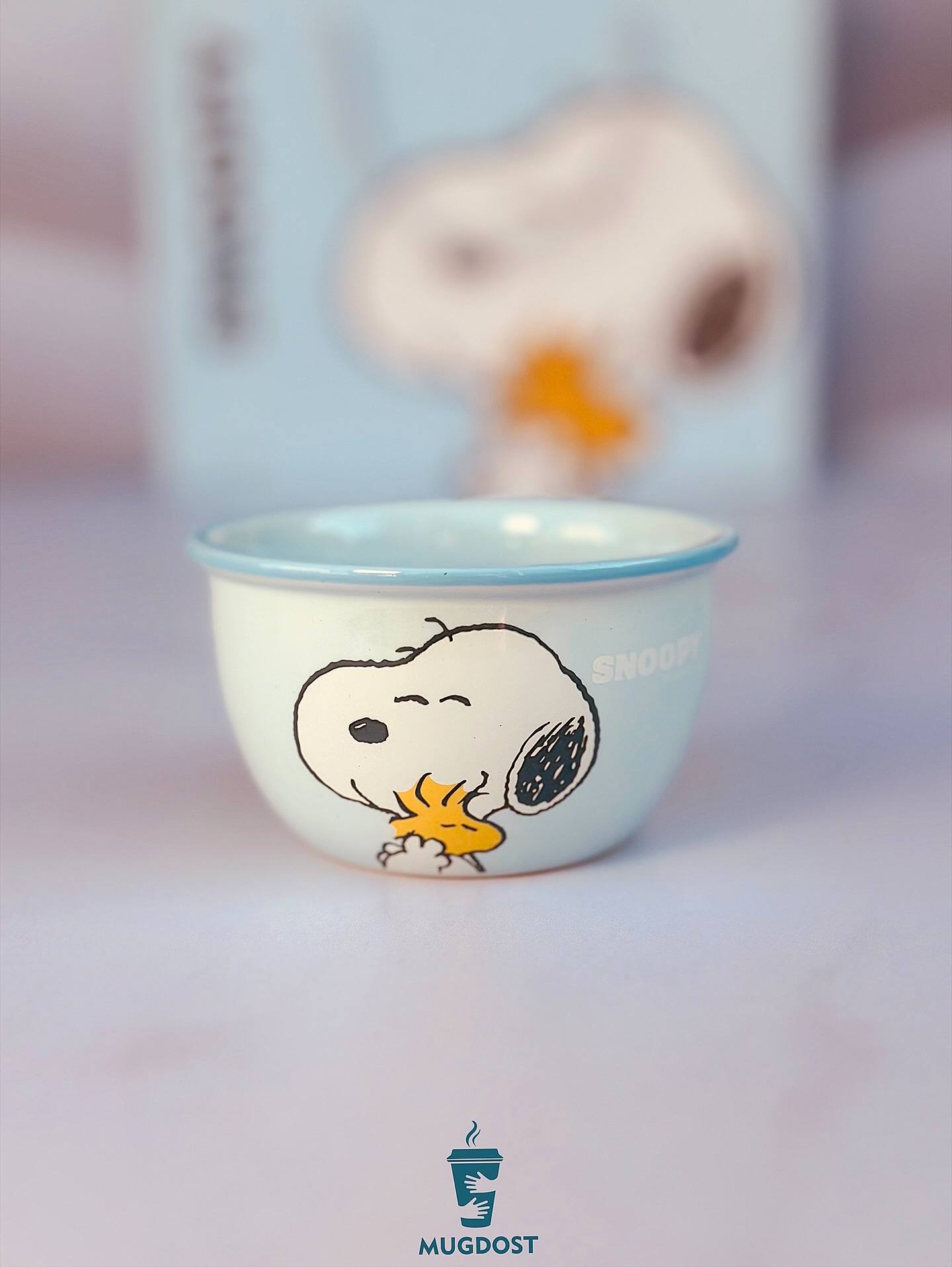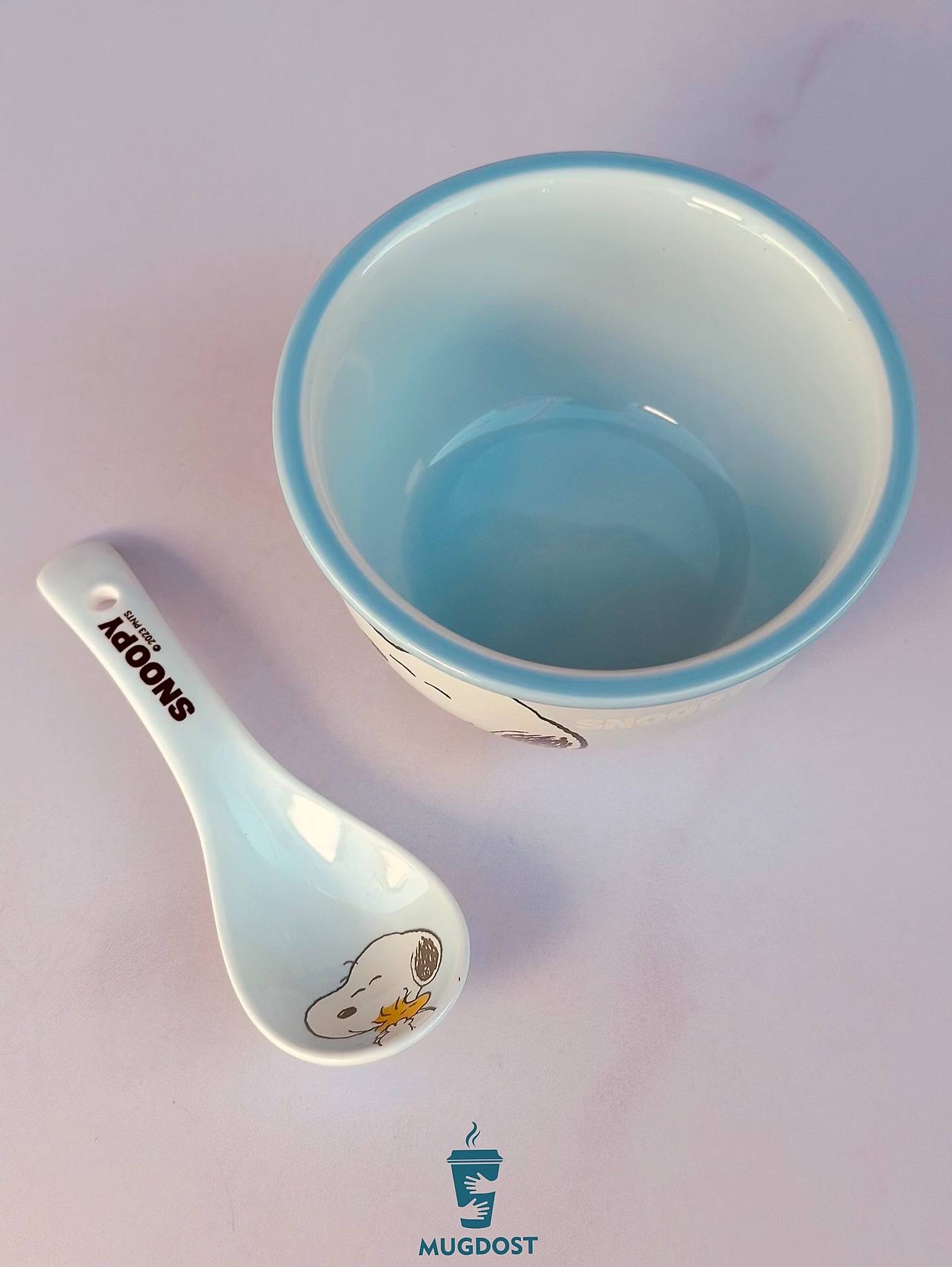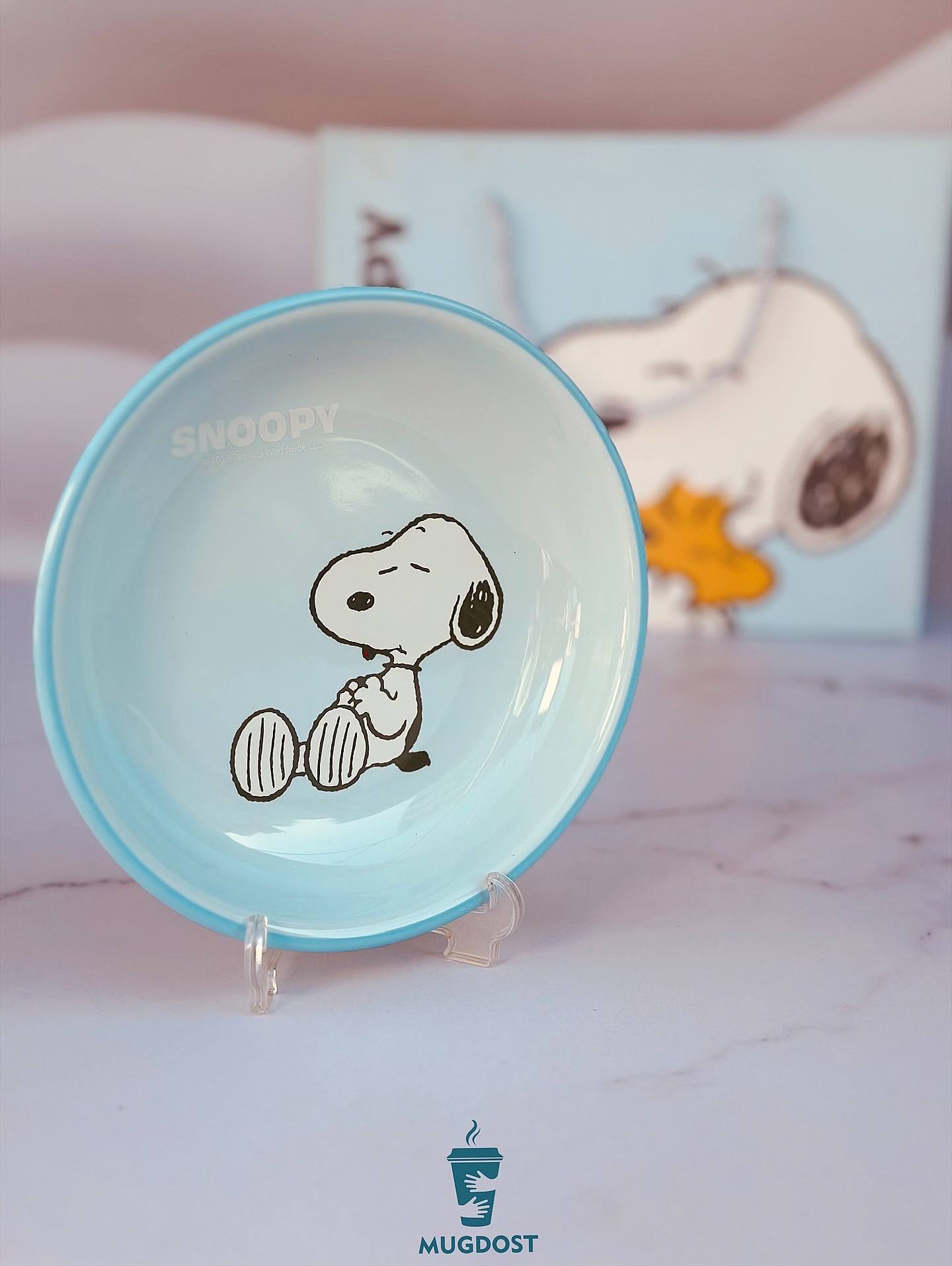 سرویس دونفره اسنوپی صورتی و آبی شامل بشقاب، کاسه و قاشق، قابل استفاده در ماکروفر و ماشین ظرفشویی، ارائه شده در پک کادویی شیک و جذاب.