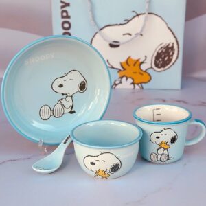 سرویس ۴ تکه اورجینال اسنوپی صورتی شامل بشقاب، کاسه، ماگ سرامیکی و قاشق است. قابل استفاده در ماکروفر و ماشین ظرفشویی و ارائه شده در پک کادویی شیک.