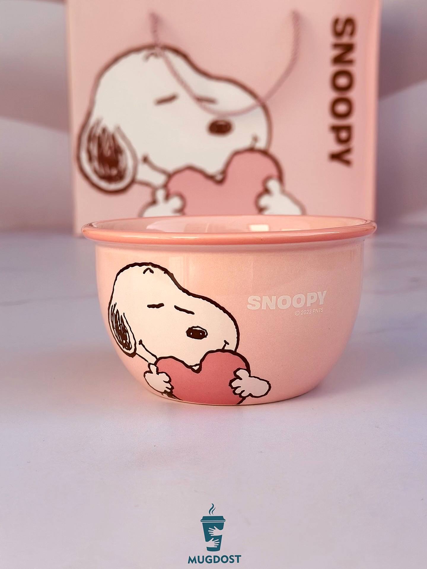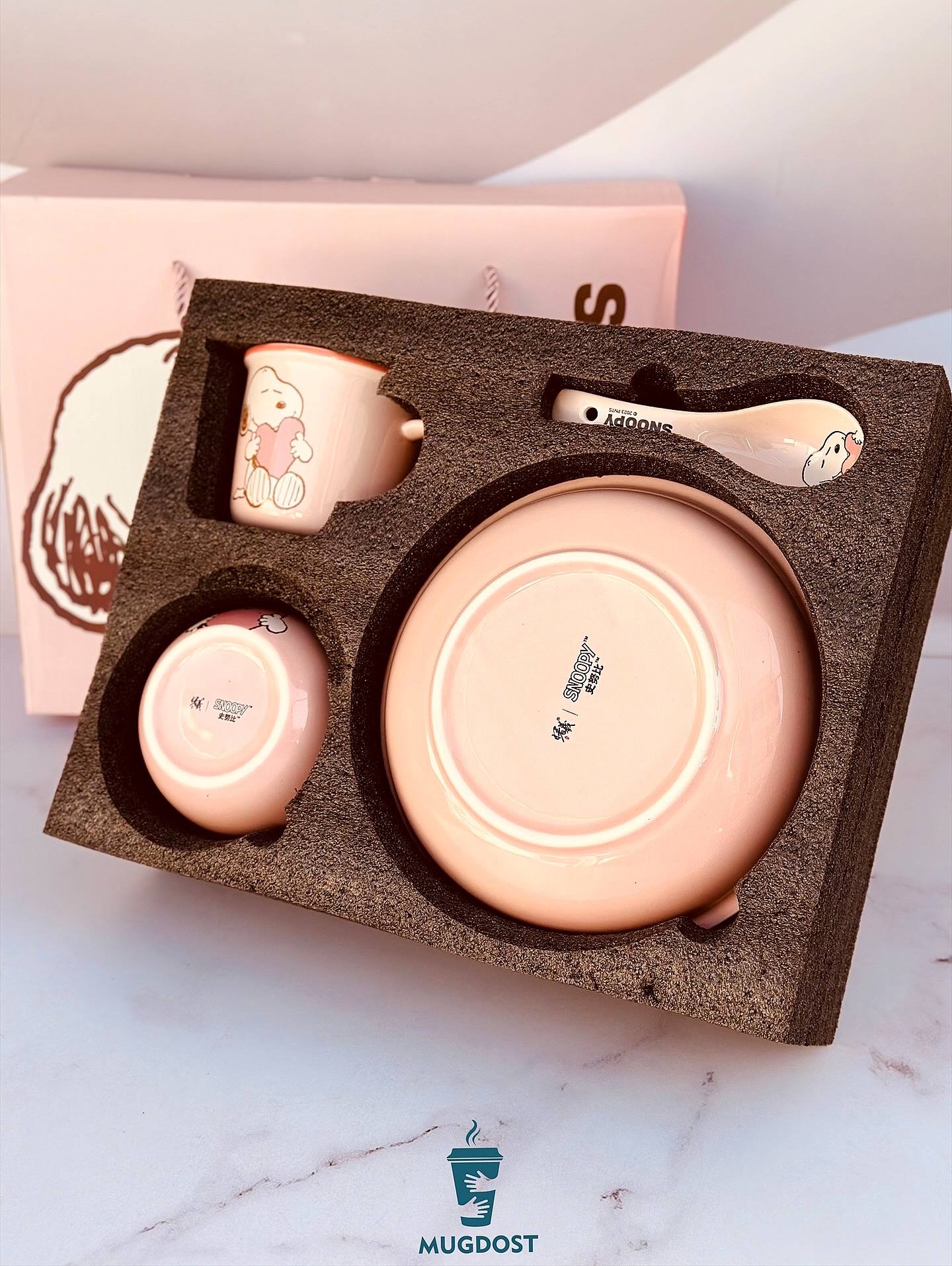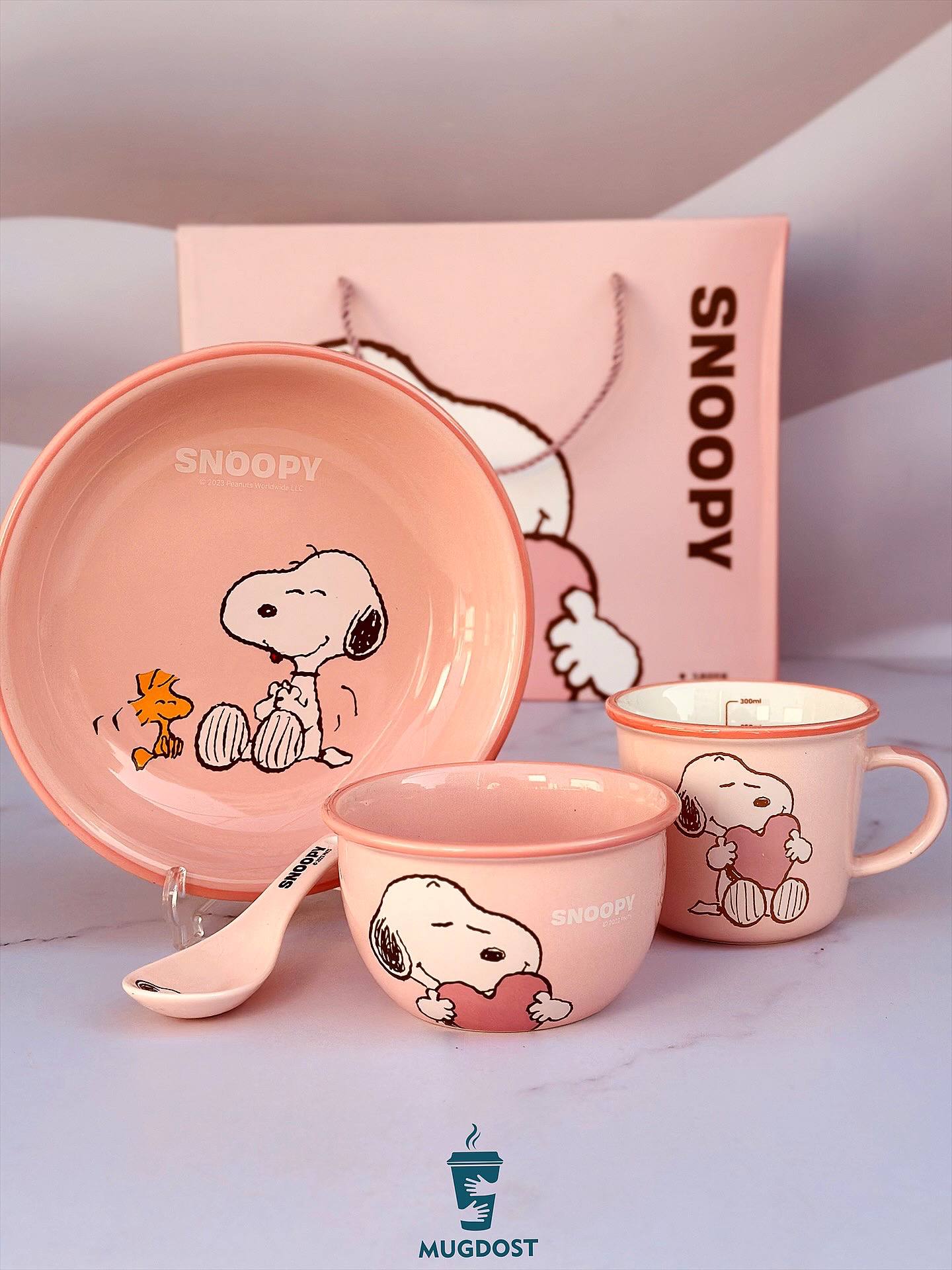 سرویس ۴ تکه اورجینال اسنوپی صورتی شامل بشقاب، کاسه، ماگ سرامیکی و قاشق است. قابل استفاده در ماکروفر و ماشین ظرفشویی و ارائه شده در پک کادویی شیک.