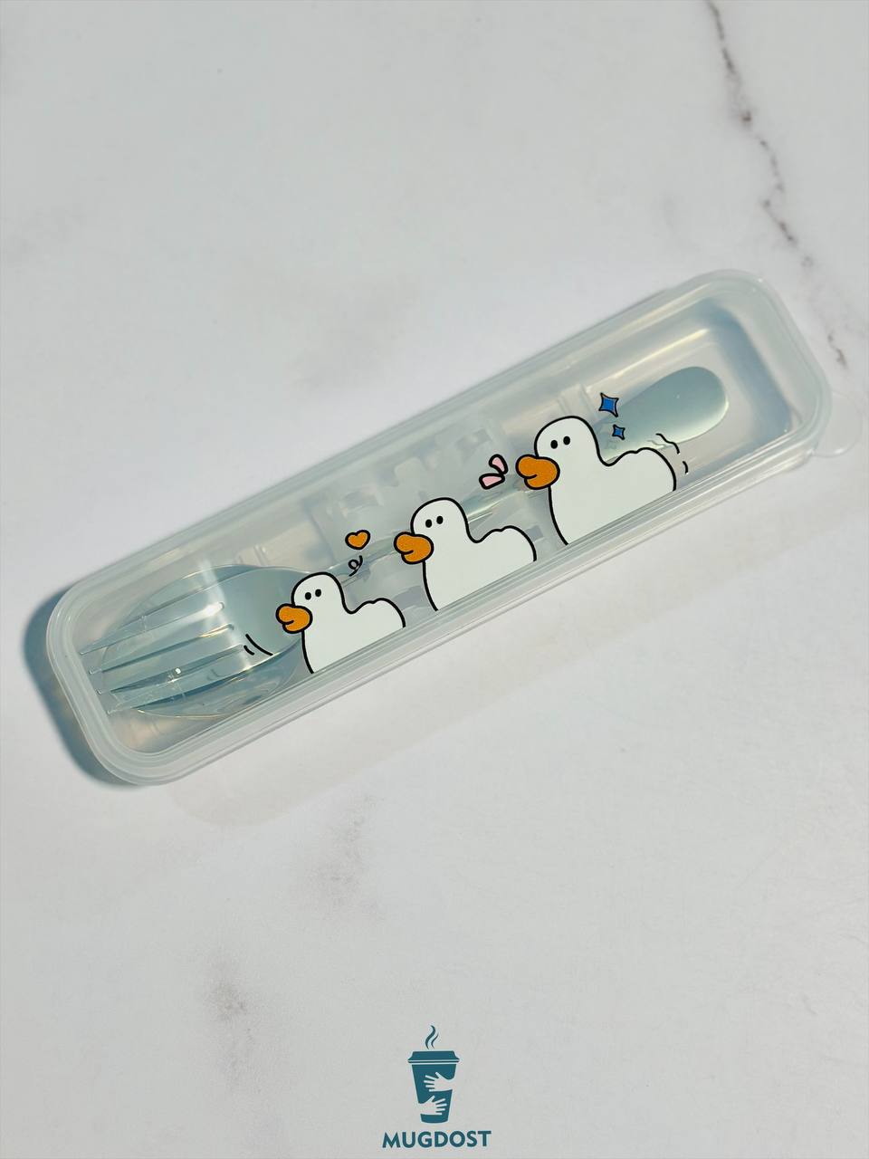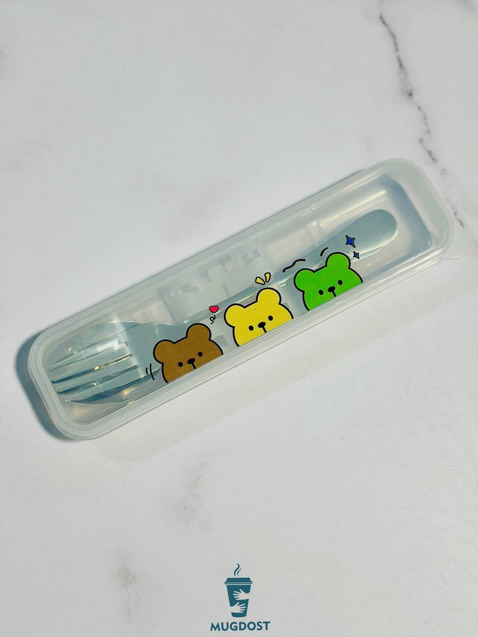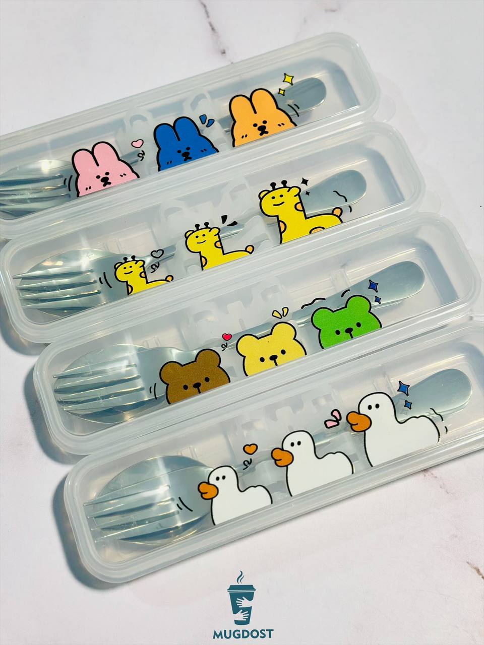 قاشق و چنگال کیوت از استیل ضدزنگ همراه با کاور پلاستیکی، سبک، مقاوم و مناسب استفاده روزمره، مدرسه، سفر و محل کار.